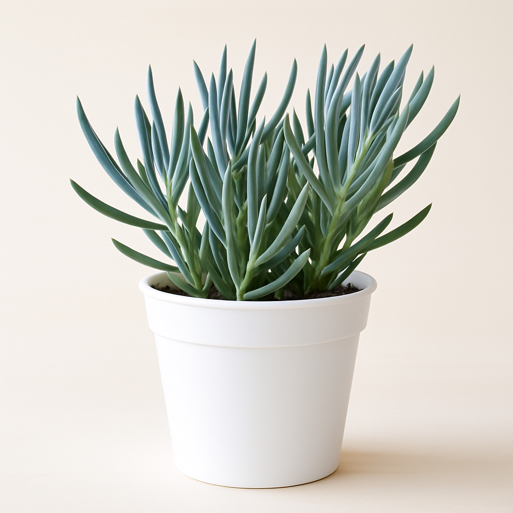 Blue Chalksticks, also known as Senecio serpens, is a striking succulent recognized for its upright, finger-like leaves in a cool blue-green shade. Its unique color and sculptural form make it a standout addition to modern plant collections and succulent arrangements.
